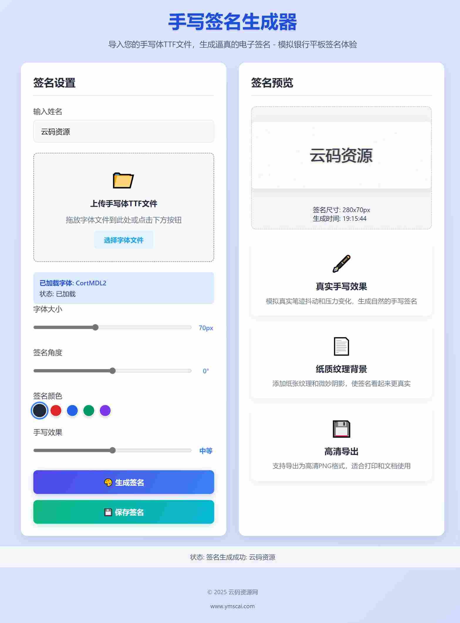 这是一款手写签名生成器源码,导入您的手写体TTF文件,生成逼真的电子签名,这个单页生成器源码是利用AI写的源码,简单测试了,可以导入TTF文件并且生成之后还可以下载签名图片。