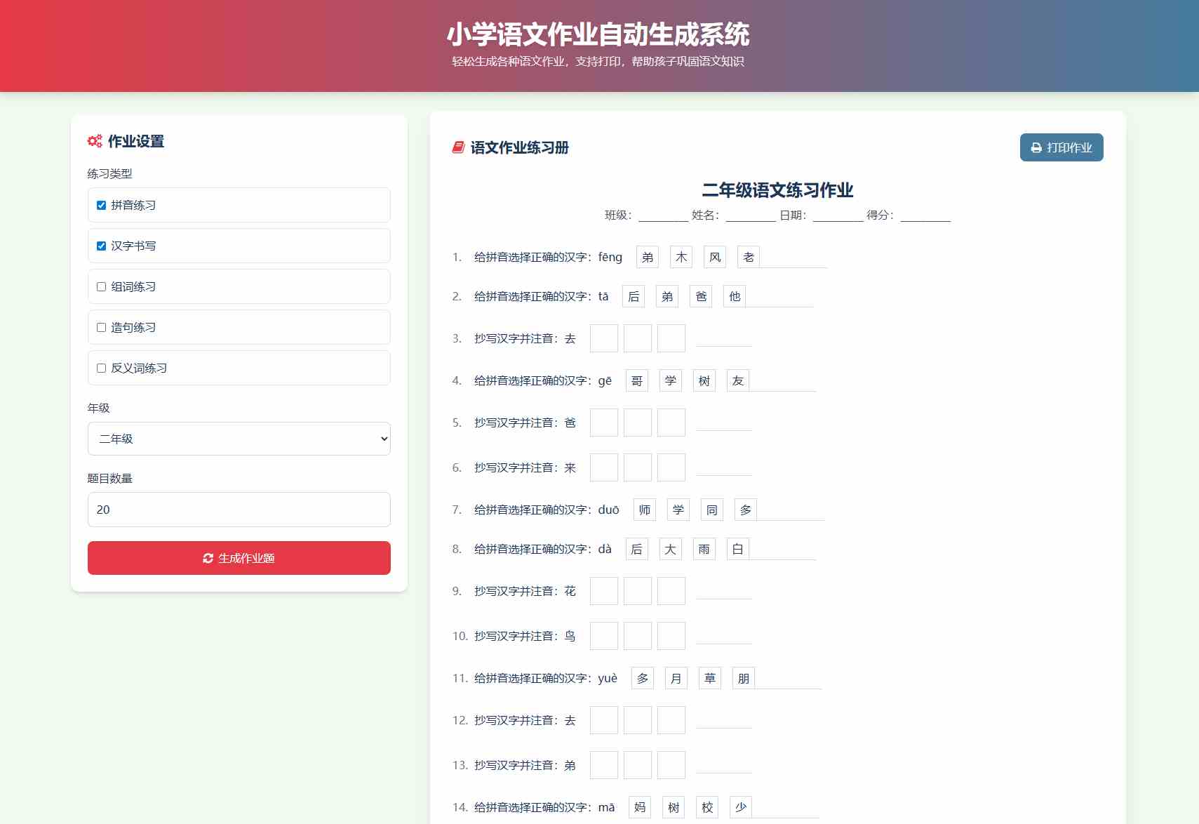 分级出题:根据不同年级(1-6 年级)提供适合该阶段的汉字和词语,确保题目难度符合学生水平。