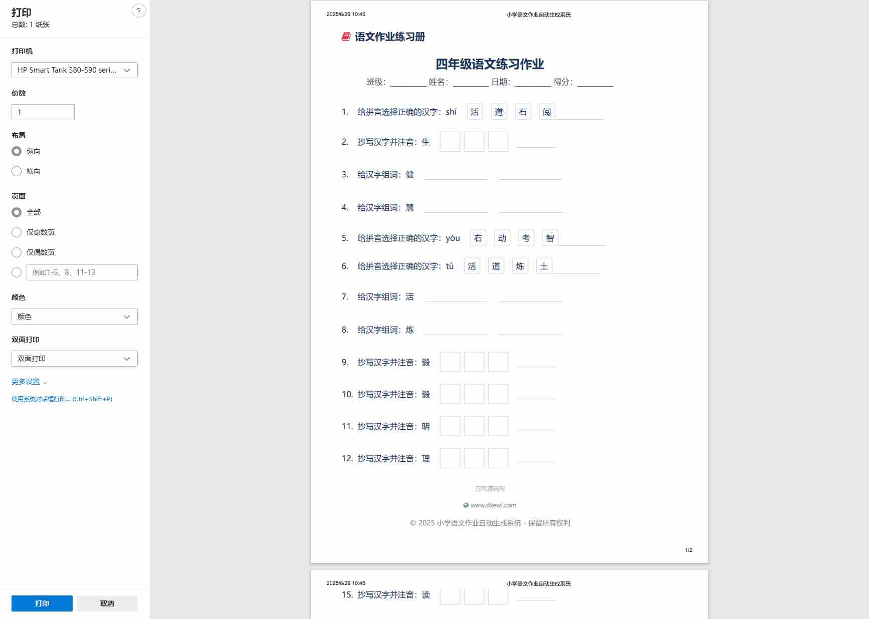 小学一到六年级语文/英语/数学作业出题布置网站源码 支持生成PDF和打印 并在底部添加了指定的版权信息和防篡改措施