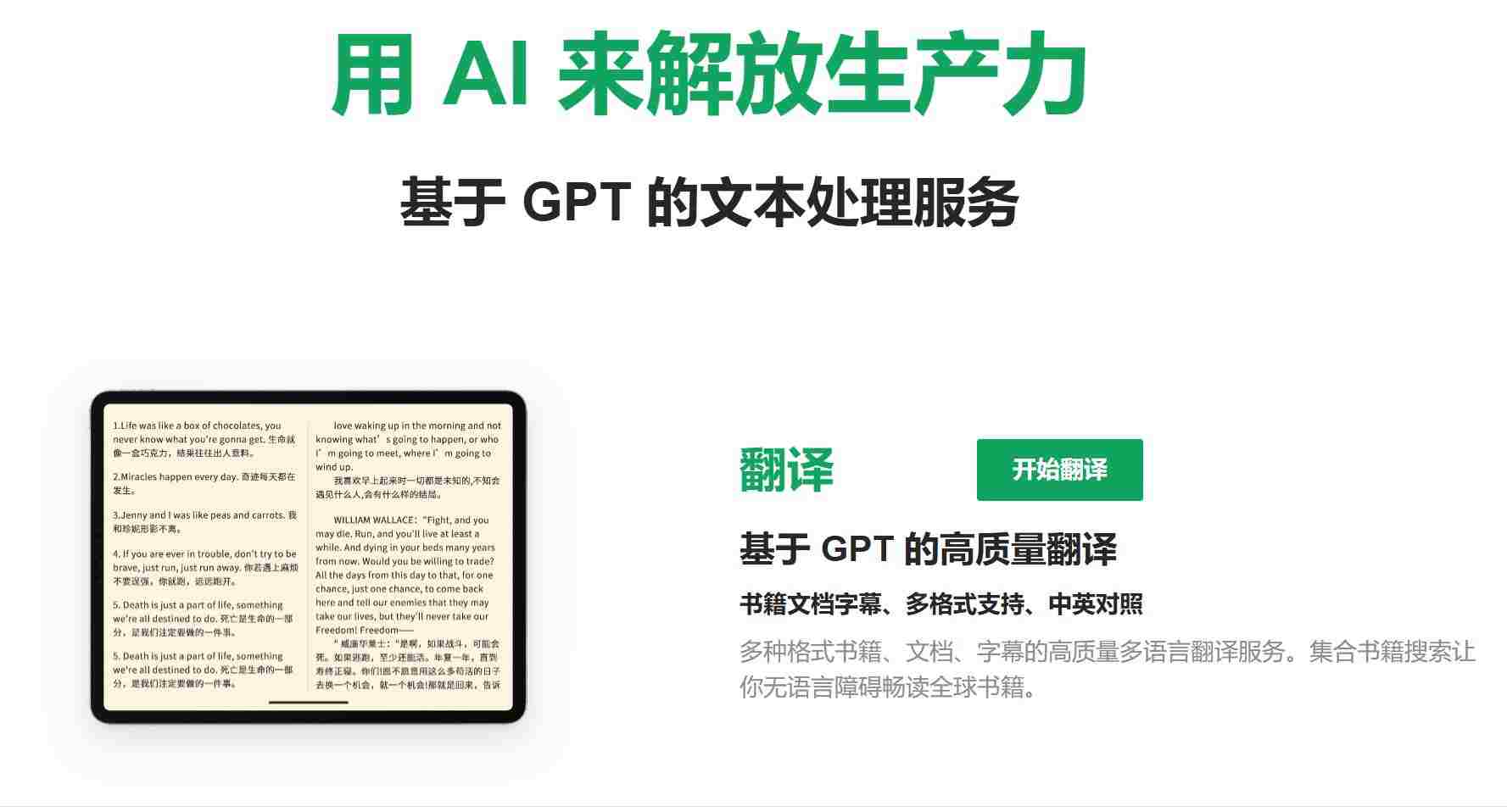 支持电子书翻译的AI服务 可以搜索并上传需要翻译的文件 支持中英文双AI翻译