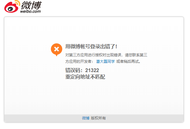 今天在用thinkcmf5做云码素材的第三方登录新浪微博登录接口的时候,报了一个错误码:21322 重定向地址不匹配,查找了一下资料,记录一下解决的方案。