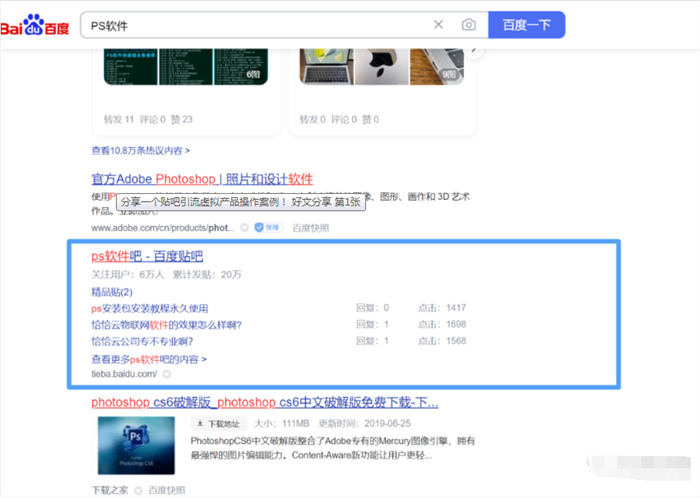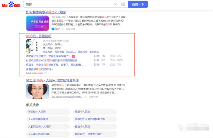 直接模拟用户需求去百度去搜索,比如搜索简历可以看到简历吧有一定的排名,PS软件也有排名。证明通过百度可以有源源不断的流量。如果自己的词库关键字在百度搜索之后贴吧并不在第一页就可以考虑换个关键词了。