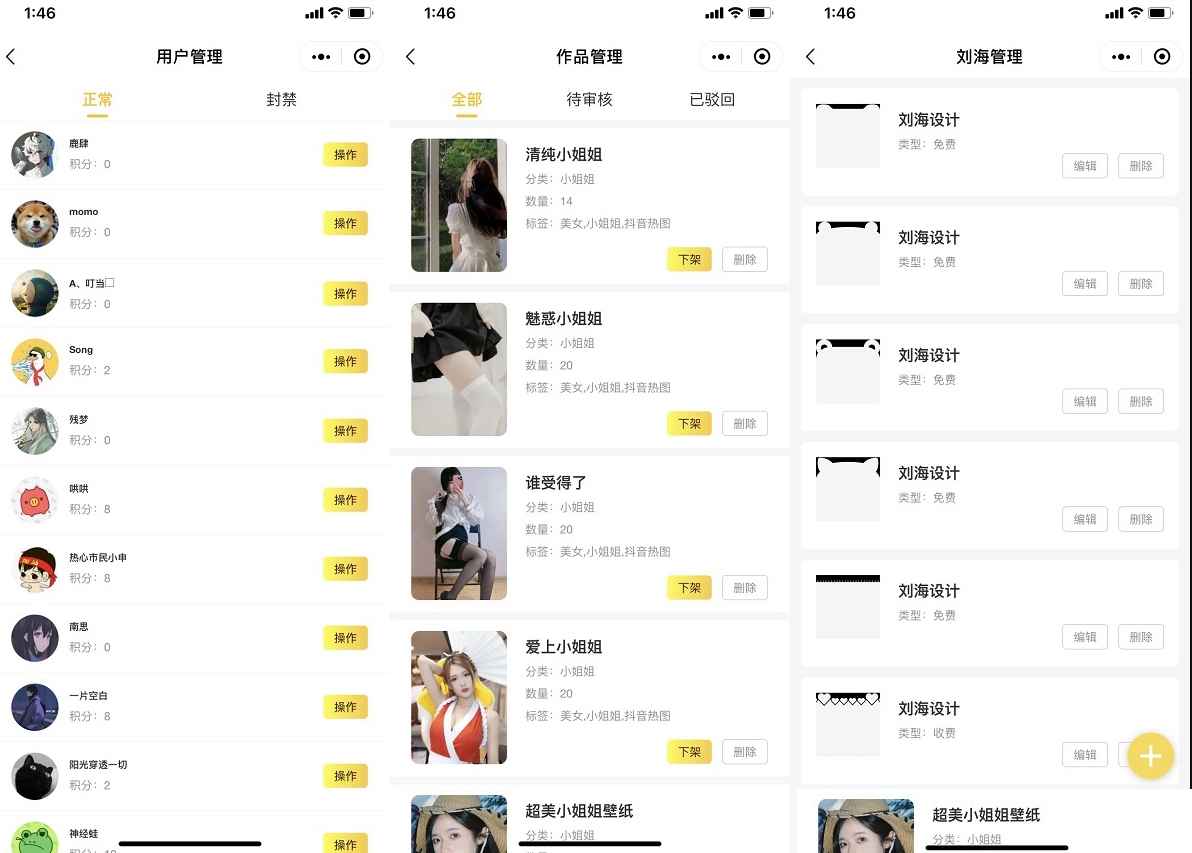 特点:支持用户投稿,后台审核后会发订阅消息给用户提示作品审核状态,增加用户粘性,支持后端修改/增加轮播图