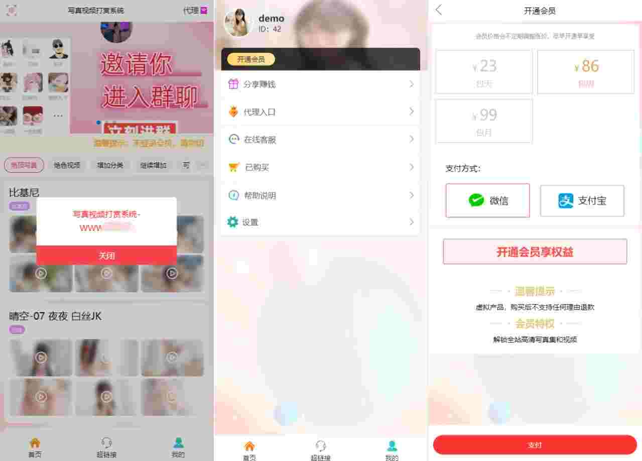 这是一款开源的写真图片及视频打赏系统源码,顾名思义他可以做写真图片打赏站也可以做视频打赏站,支付对接了易支付,拥有独立代理后台,全部源码无加密,另外也可以配合付费进群使用。支付扣量、域名防洪这些基本的就不介绍了,看图吧!留给有需要的人!