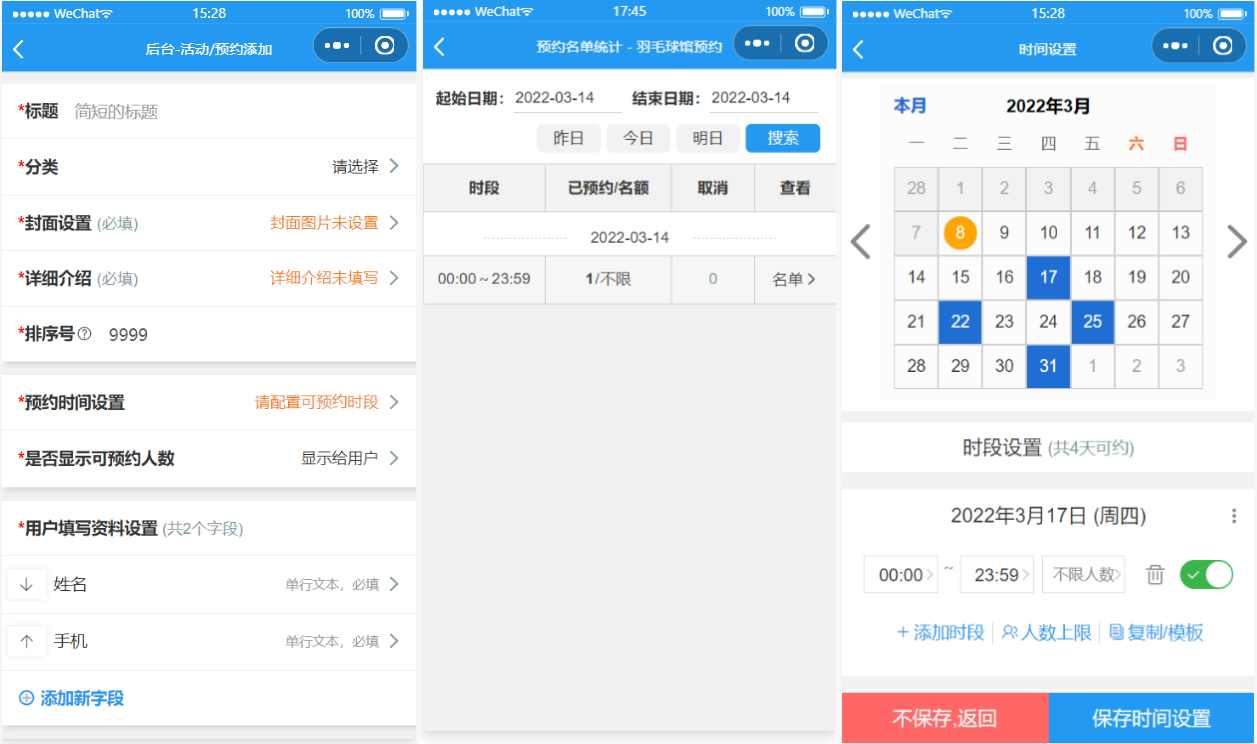 场馆预约管理:开始/截止时间/人数均可灵活设置,可以自定义客户预约填写的数据项