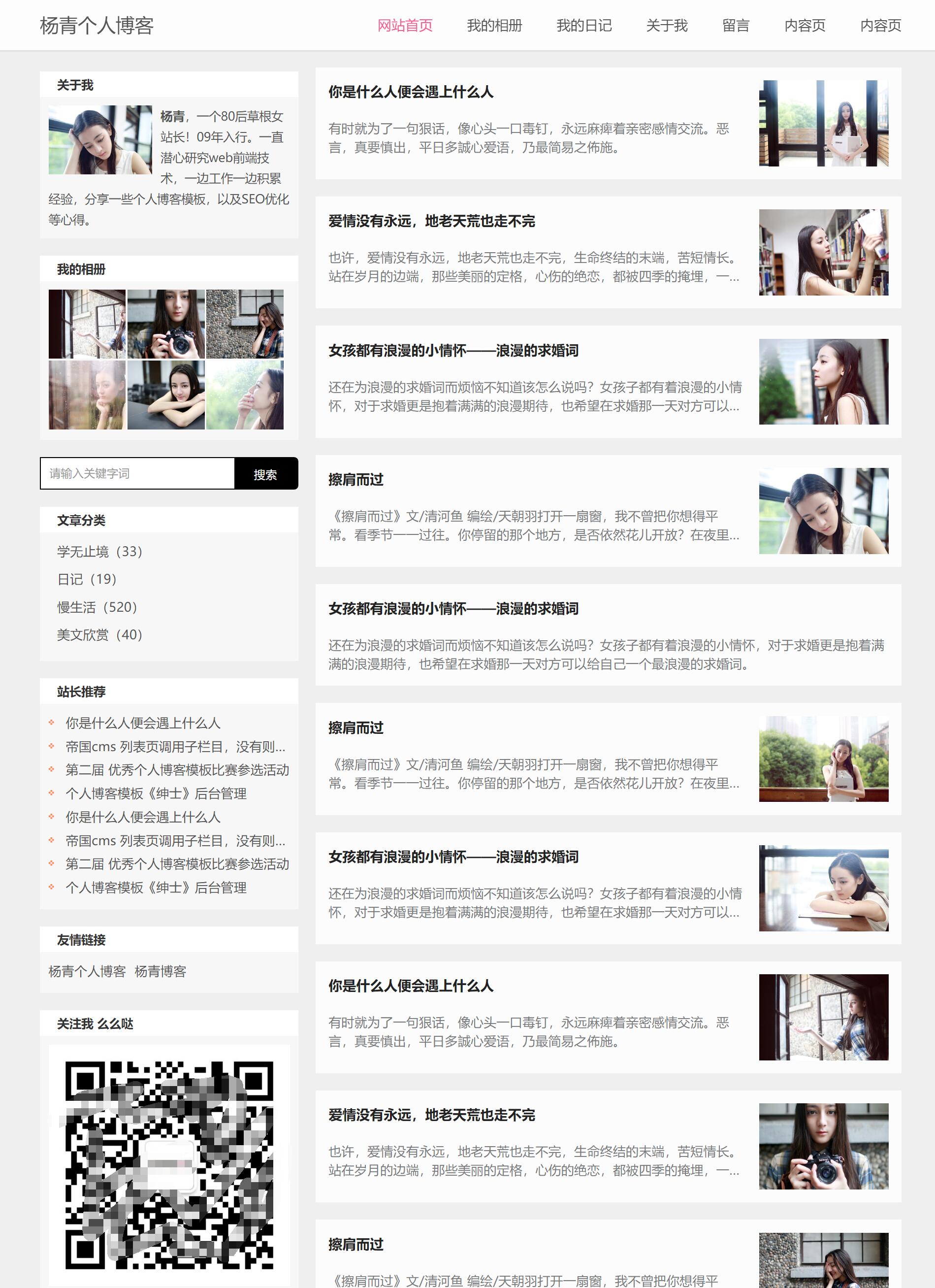 html5个人博客模板《simple》简单、清新。网页整体布局采用传统的布局方式,相册采用瀑布流的展现方式,内容页固定层,相册内容页大图以及列表展示。适应手机,平板。顶部导