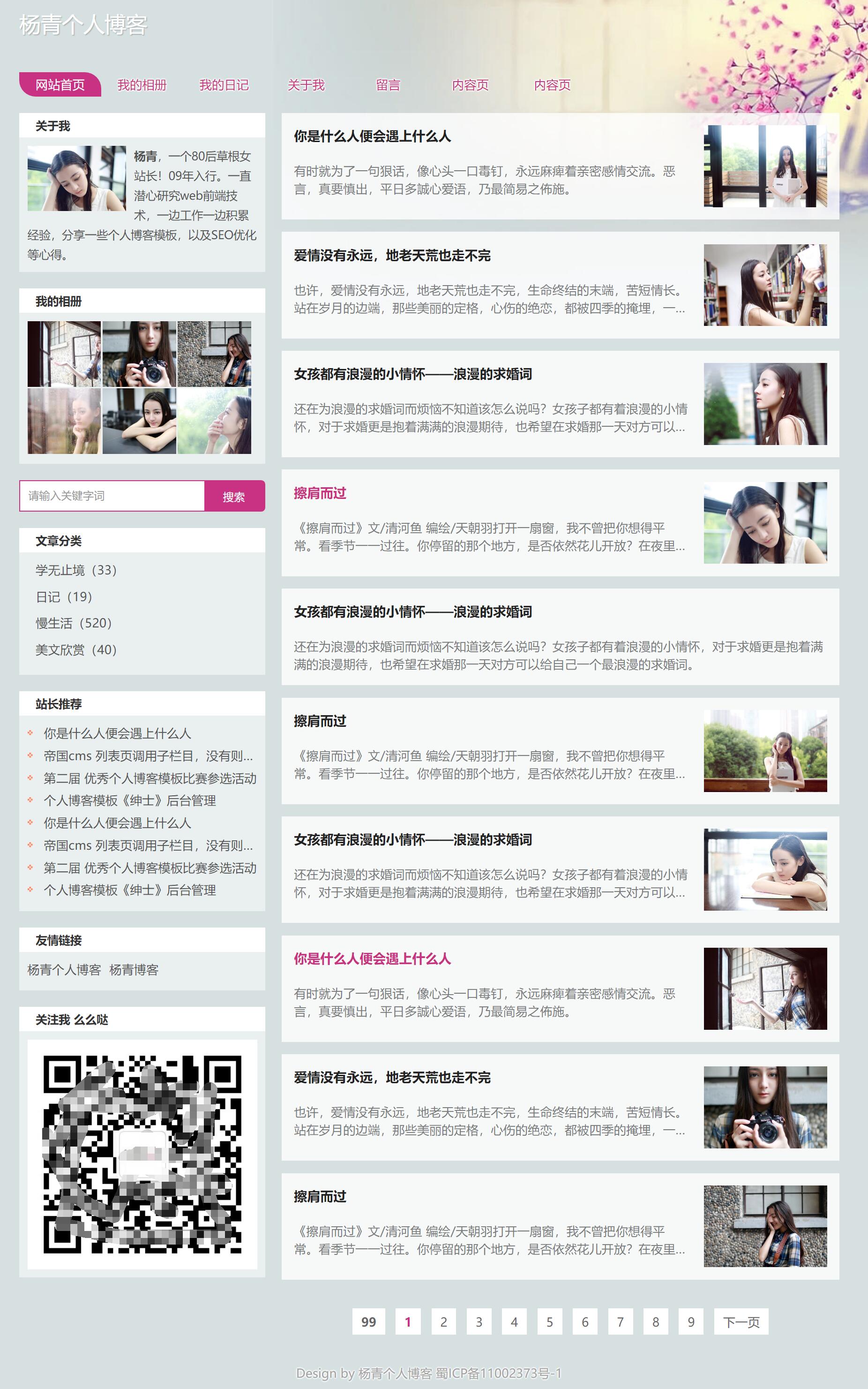 此个人博客模板取名《繁花》,繁花亦作“ 繁华 ”。看似简单的布局,却如幽静的小院,让你过目而不忘,耐人寻味。适合女生,偏文艺,清新。