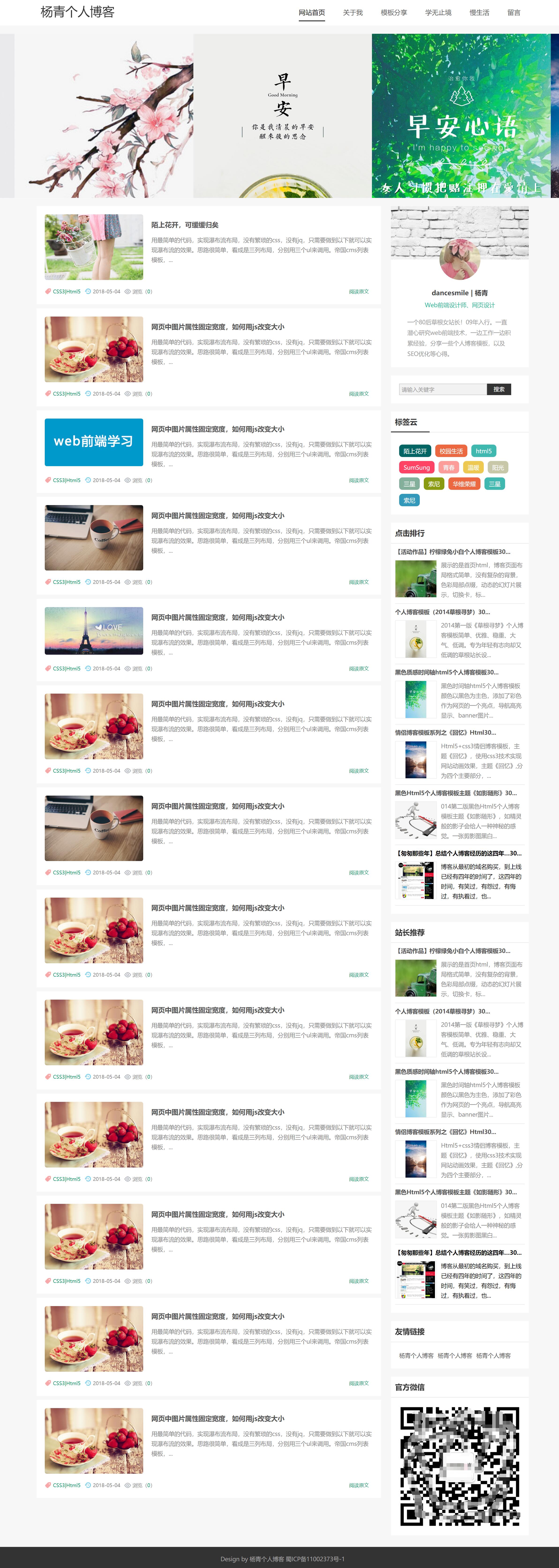 tml5个人博客模板《早安》,采用html5+css3设计,首页全屏5图,增加标签云。列表有两种模板,分别是图文列表,一种是图片瀑布流形式,右侧增加网站导航栏。针对内容页文字多的话,右侧新增广告位,当滚动到一定位置