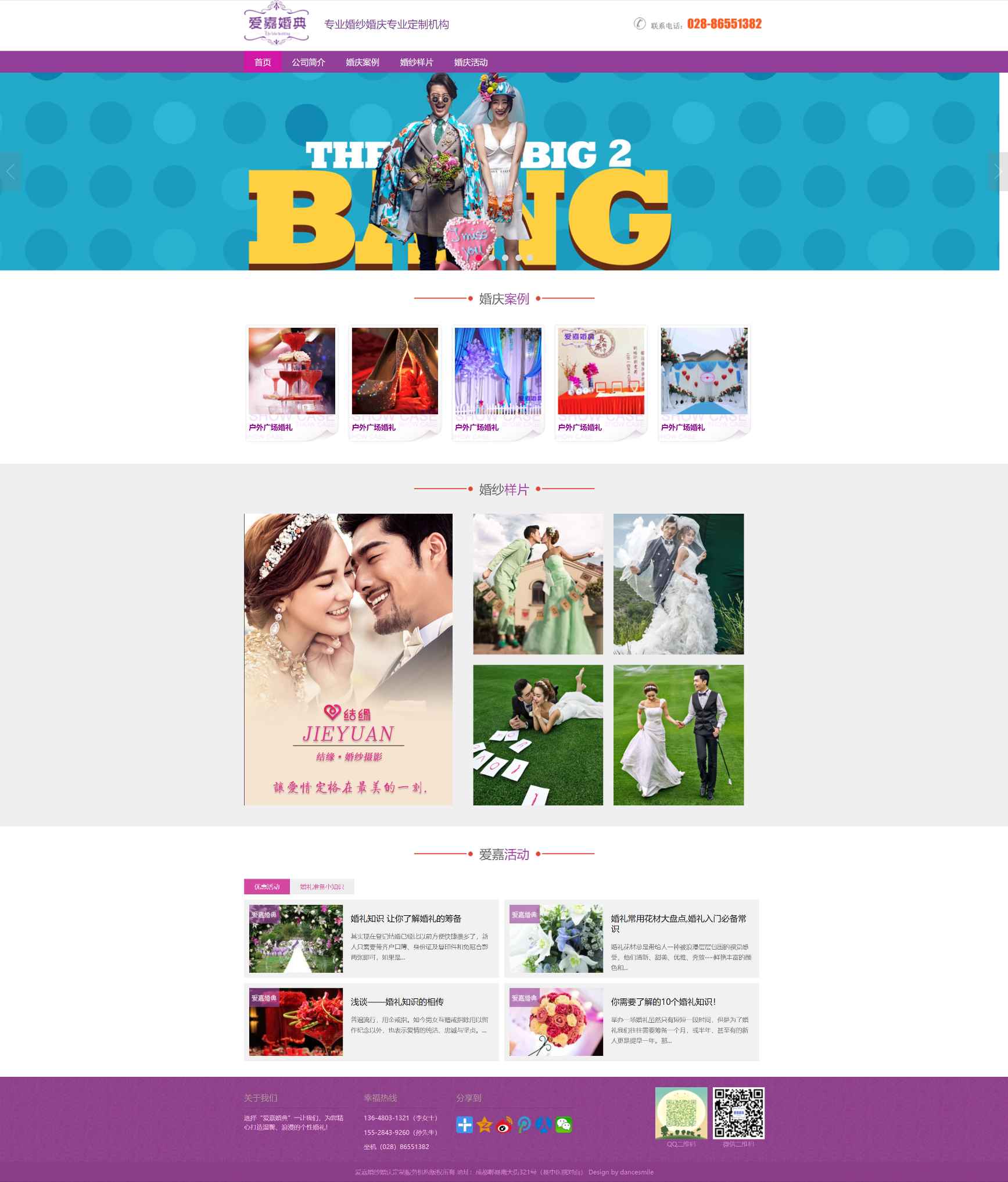 免费紫色婚庆公司企业网站模板,这套模板一共5个页面,首页,列表页,内页,单页等。整套齐全,非响应式布局。这套婚庆公司企业模板,颜色以紫色为主,涉及图片展示以及资讯