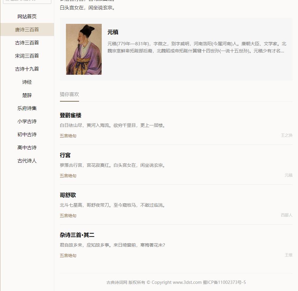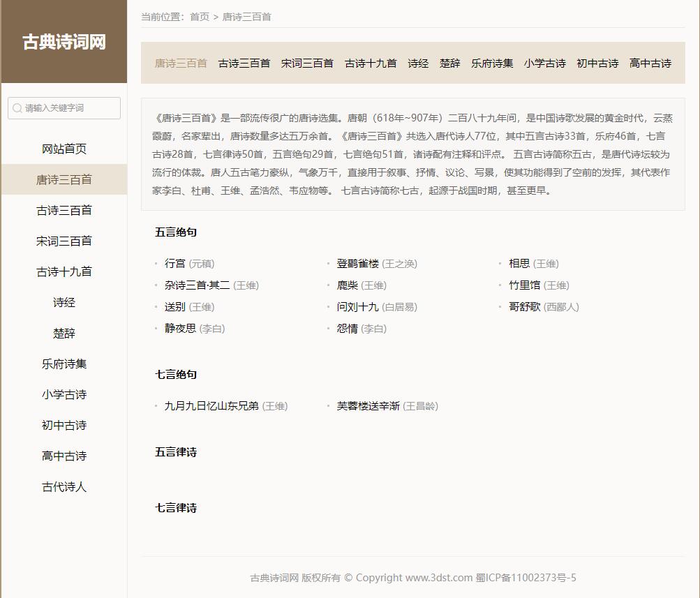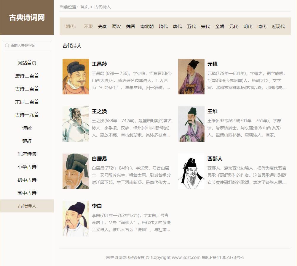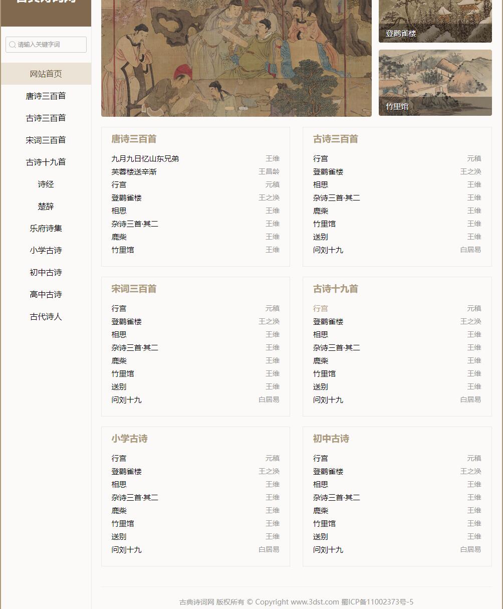 html古典诗词网站模板,采用html5+css3制作,响应式布局,古典风格,适合做古典内容的诗词,古文,书籍类,或者喜欢纯文字类型的站点。此套目前只提供静态页面下载,暂无帝国cms后台源码,需要的可添加微信。
