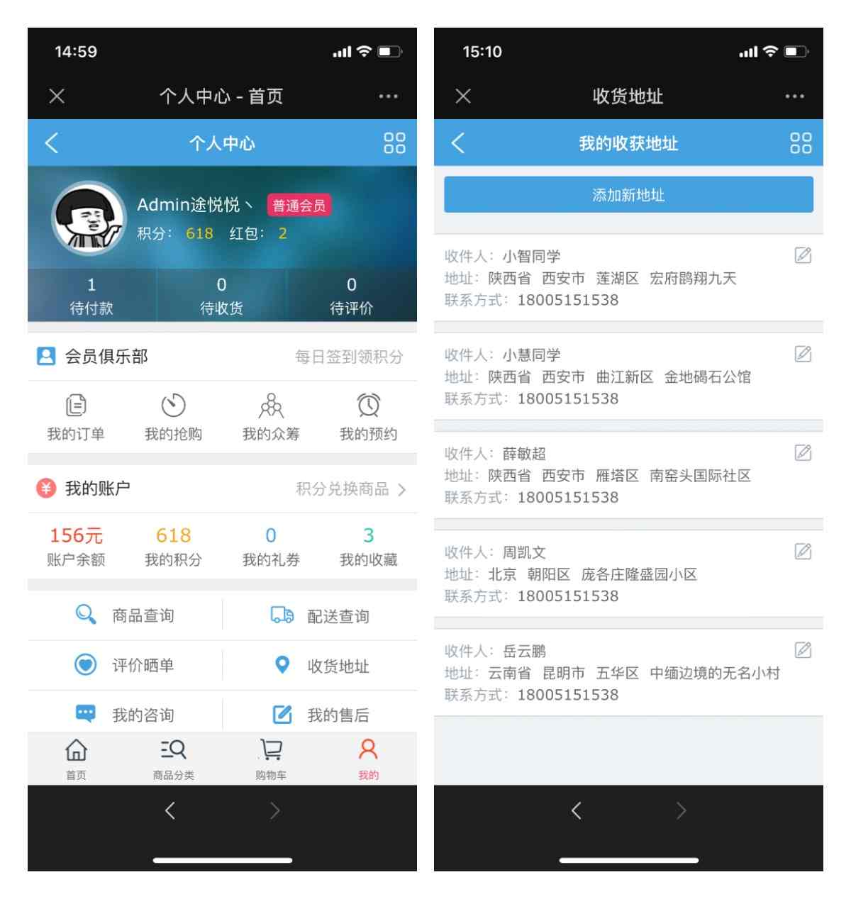 纯前端H5版本商城,页面清晰易上手、部署简单、H5灵活可广泛应用(可App嵌套/微信公众号/H5端),包含:商品展示、商品分类、分销(暂时移除)购物车、地址管理、售后管理、投诉建议、个人中心等页面