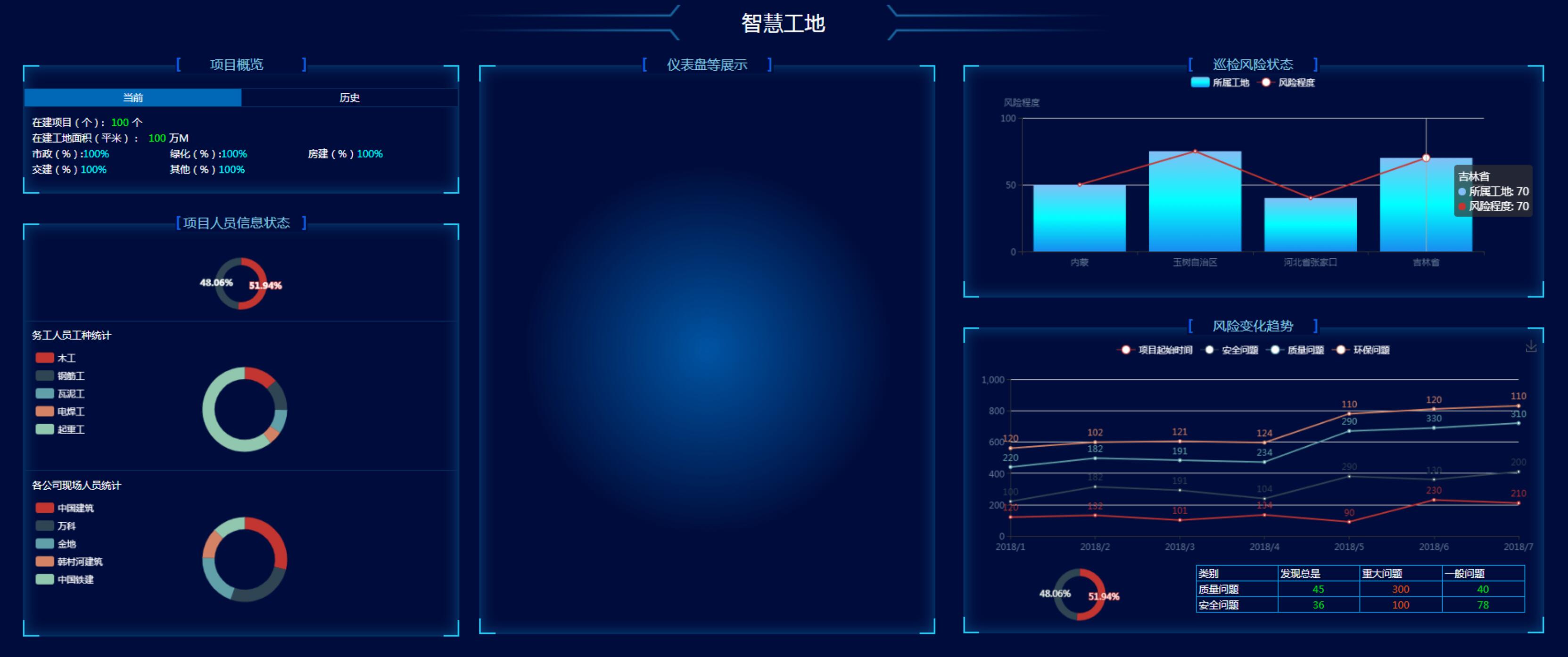 智慧工地大数据数据可视化展示平台,基于工程互联网的BIM、大数据、物联网及人工智能的技术落地应用,拓宽工程数据及信息的收集、管理和使用途径,提升工程信息化管理品质,打造工程大数据分析与挖掘工具,提高工程智慧化管理水平,实现工程进度、质量、安全等管理信息的可视化;