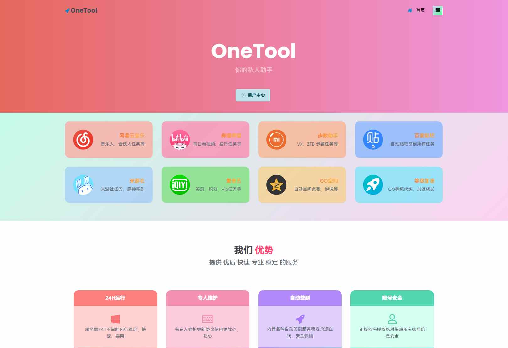 可以帮助用户快速完成各种任务。例如网易云音乐每日签到、每日云贝、打卡 300 首歌曲、音乐人每日任务等;WX 运动健身记步范围设定, QQ 空间秒赞秒评;哔哩哔哩视频短片每日签到、每日在线观看、投币机、动漫作品每日签到、分享视频、天选抽奖活动;百度贴吧签到;爱奇艺 VIP 每日任务、每日抽奖活动、二端每日签到等等,都可以通过 OneTool 进行快速操作。