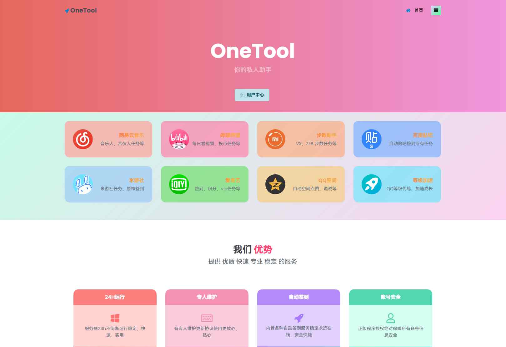 可以帮助用户快速完成各种任务。例如网易云音乐每日签到、每日云贝、打卡 300 首歌曲、音乐人每日任务等;WX 运动健身记步范围设定, QQ 空间秒赞秒评;哔哩哔哩视频短片每日签到、每日在线观看、投币机、动漫作品每日签到、分享视频、天选抽奖活动;百度贴吧签到;爱奇艺 VIP 每日任务、每日抽奖活动、二端每日签到等等,都可以通过 OneTool 进行快速操作。
