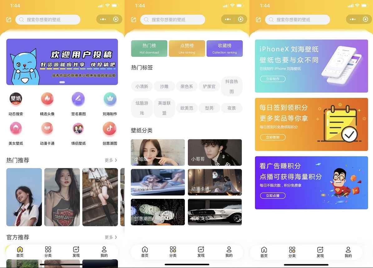 特点:支持用户投稿,后台审核后会发订阅消息给用户提示作品审核状态,增加用户粘性,支持后端修改/增加轮播图