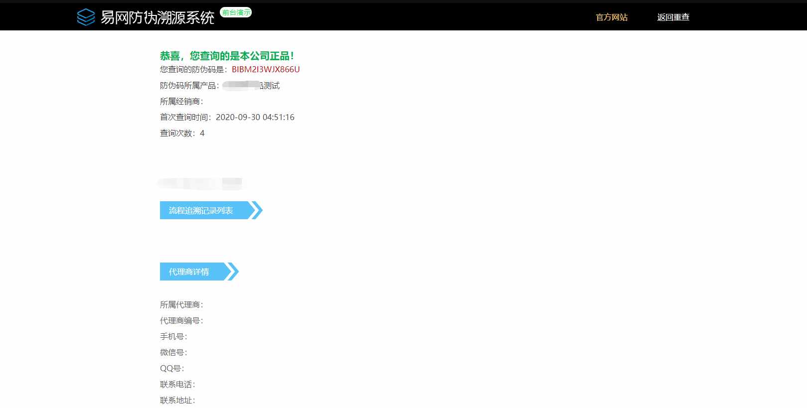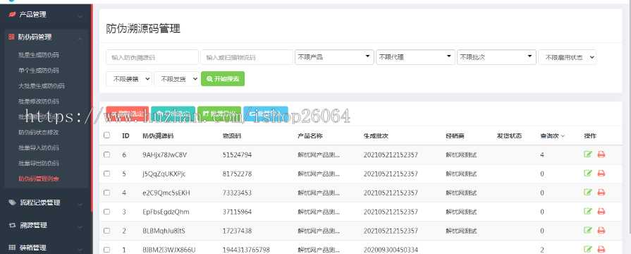 一物一码,活码管理。全平台防伪防窜货和溯源查询,装箱,发货,退货,流程记录以及经销商管理平台,广泛应用于农产品,食品,化妆品,药品,数码产品,