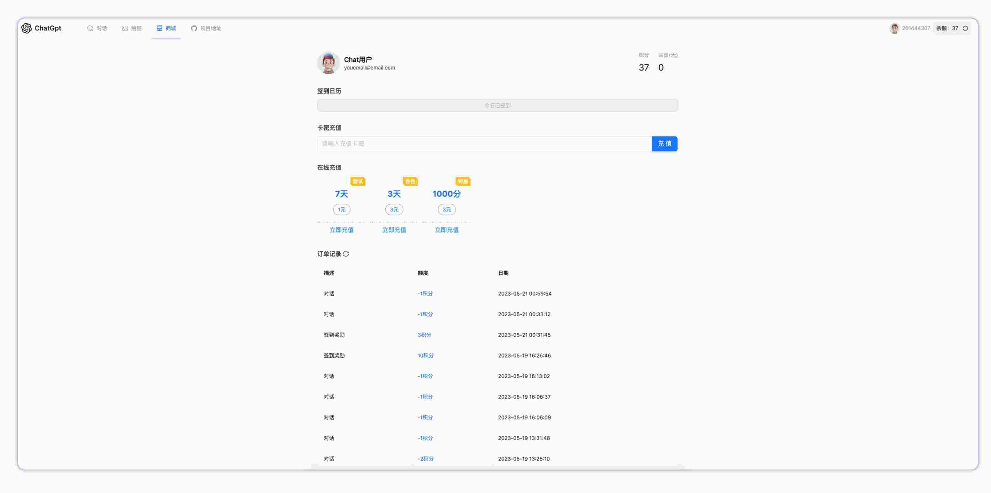 ChatGPT 3.5+4.0和DALL-E的强大功能,还能支持代码编写、短文创作、电影剧本和卡密管理,还有用户列表、消息记录、支付配置和订单记录等高级功能。