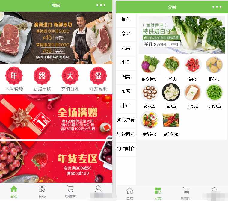 界面非常漂亮的一款我厨蔬菜生鲜商城小程序源码,tab切换效果,分享给大家参考。
