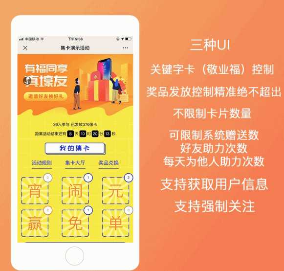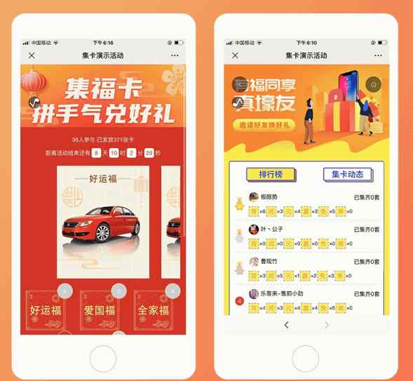 集卡模块是个轻量的活动模块,粉丝可以在活动任何阶段参与到活动里来。只要商家需要在朋友圈传播信息、公众号需要增加粉丝熟悉度,扩大影响力,商家需要为自己引流,提升购买率等等都可以使用。可以在商场做活动、单个商家做活动、自媒体做活动、政府部门做政策推广等等。