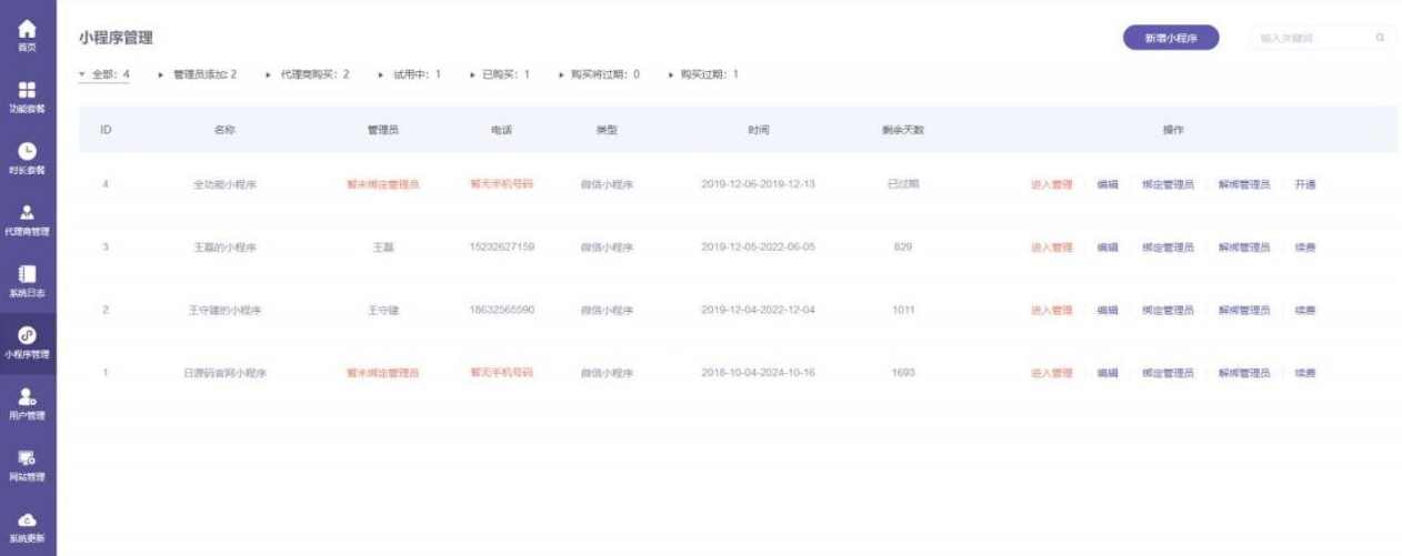 代理商管理:拥有底层源码系统,发展自己的代理商,列表清晰展示各代理商状态,详细设置对代理商账号信息、创建小程序的个数、系统到期时间等进行管理。