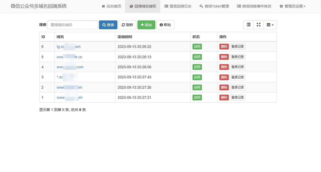 微信公众号多域名回调功能:微信公众号后台默认只能授权2个网页域名,用本系统突破这个限制,用同一个公众号对接无限多个网站。网站后台支持回调域名白名单的管理,以及登录