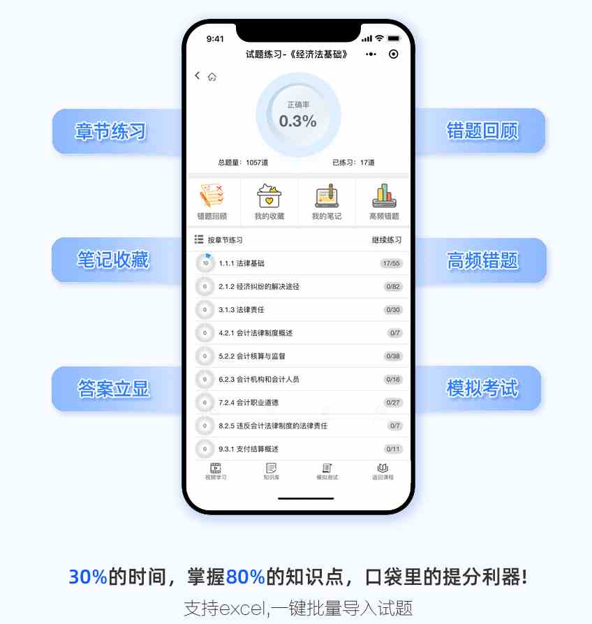 正确率、做题记录、错题回顾、我的收藏、我的笔记、高频错题、章节练习、视频学习、知识库、模拟测试…