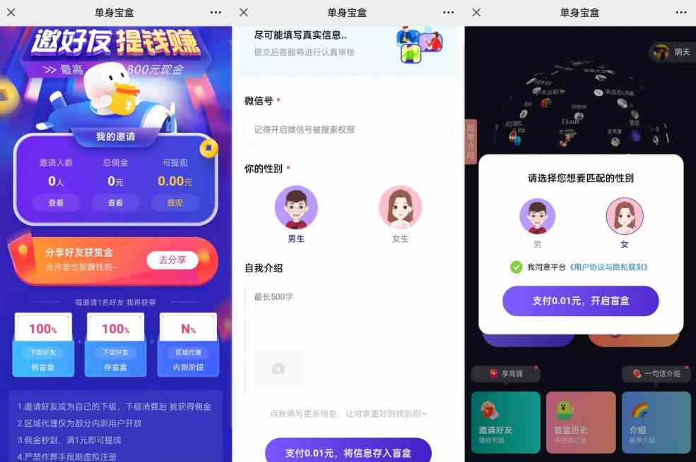 比较忙,没有测试,不过看去来是一套比较完整盲盒交友系统源码,分为API端(ThinkPHP)、后台(node)、前端uniapp。