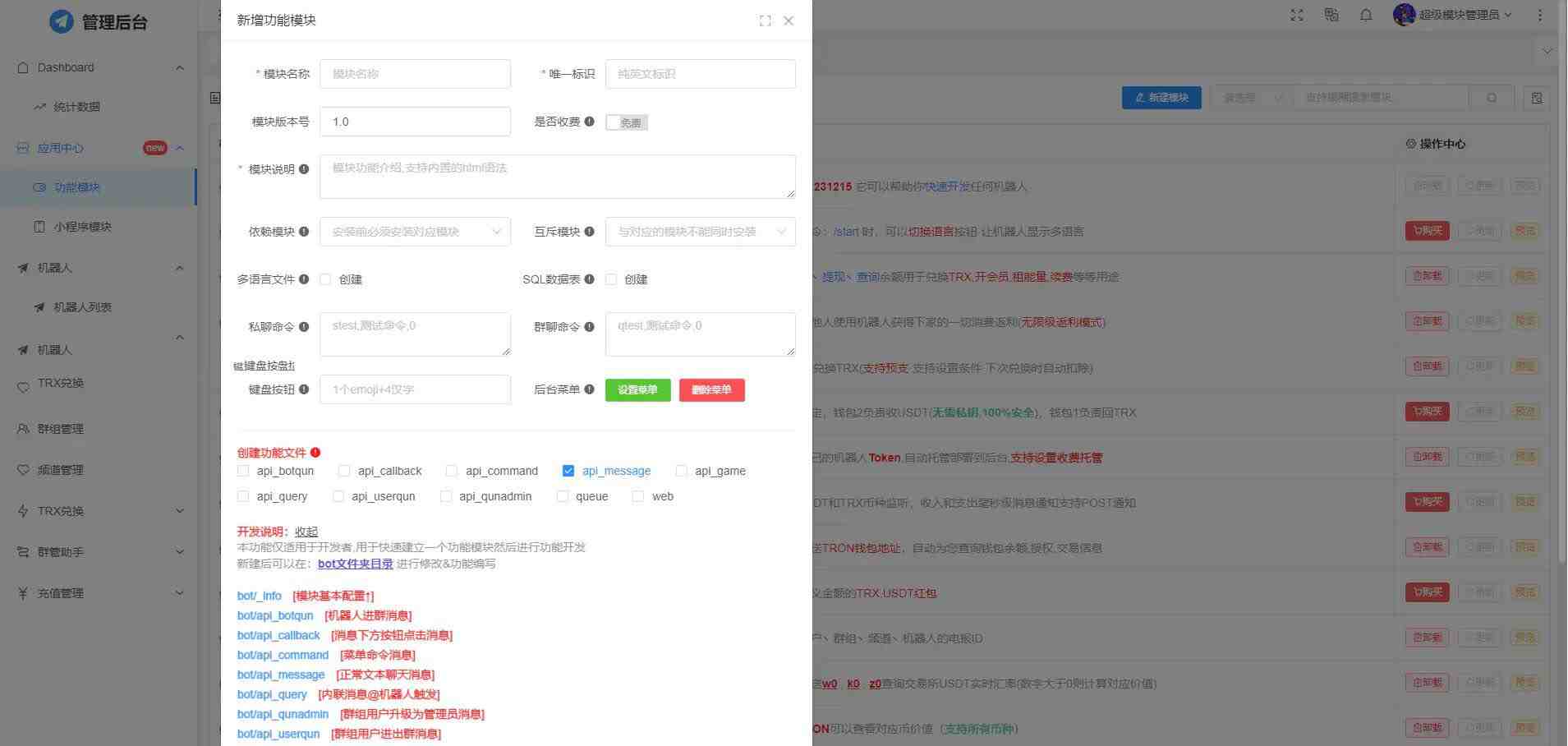 trx兑换 闪兑 关键字监控 群管 usdt监控 余额查询 推广分享 等几乎常见的tg机器人功能都有