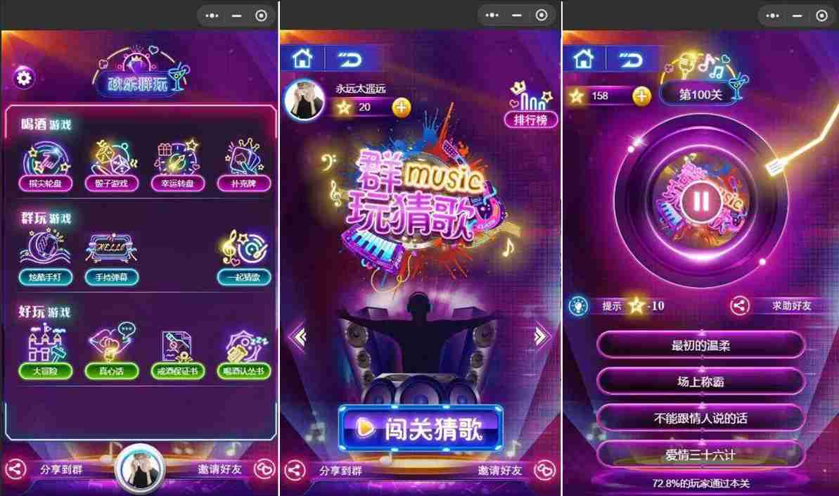 酷炫猜歌喝酒小程序开源源码,源码啥的都没有问题,只是配置的资源包找不到了,有兴趣的可以去找找研究下【微擎的】