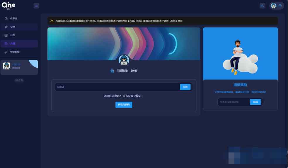 支持兑换码管理,支持批量生成和导出兑换码,可使用兑换码为账户进行充值。
