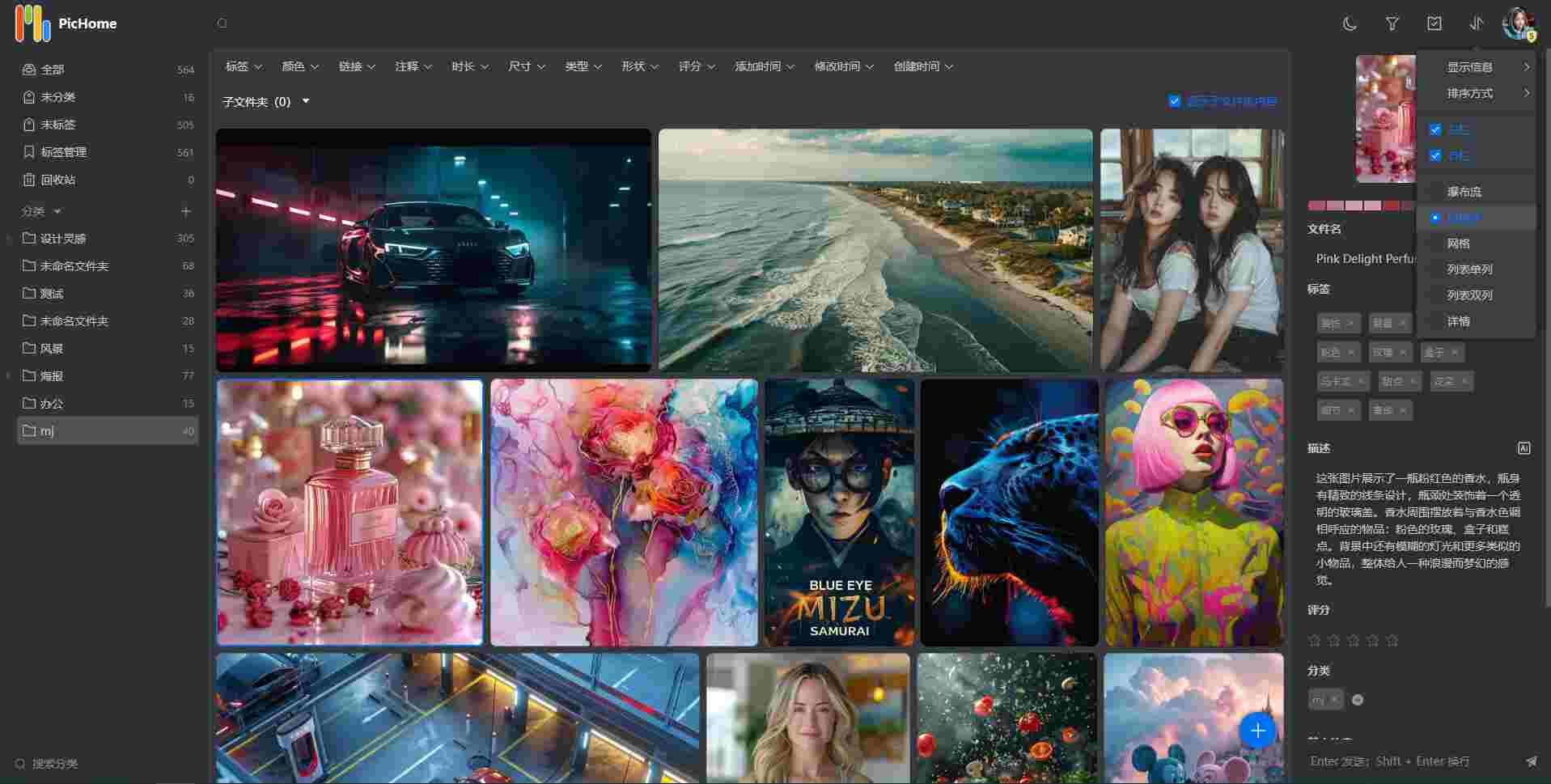 PicHome:提供包括瀑布流、自适应布局、网格、列表、双排列表和详细视图在内的多种模式,以适应不同用户的视觉和操作体验。