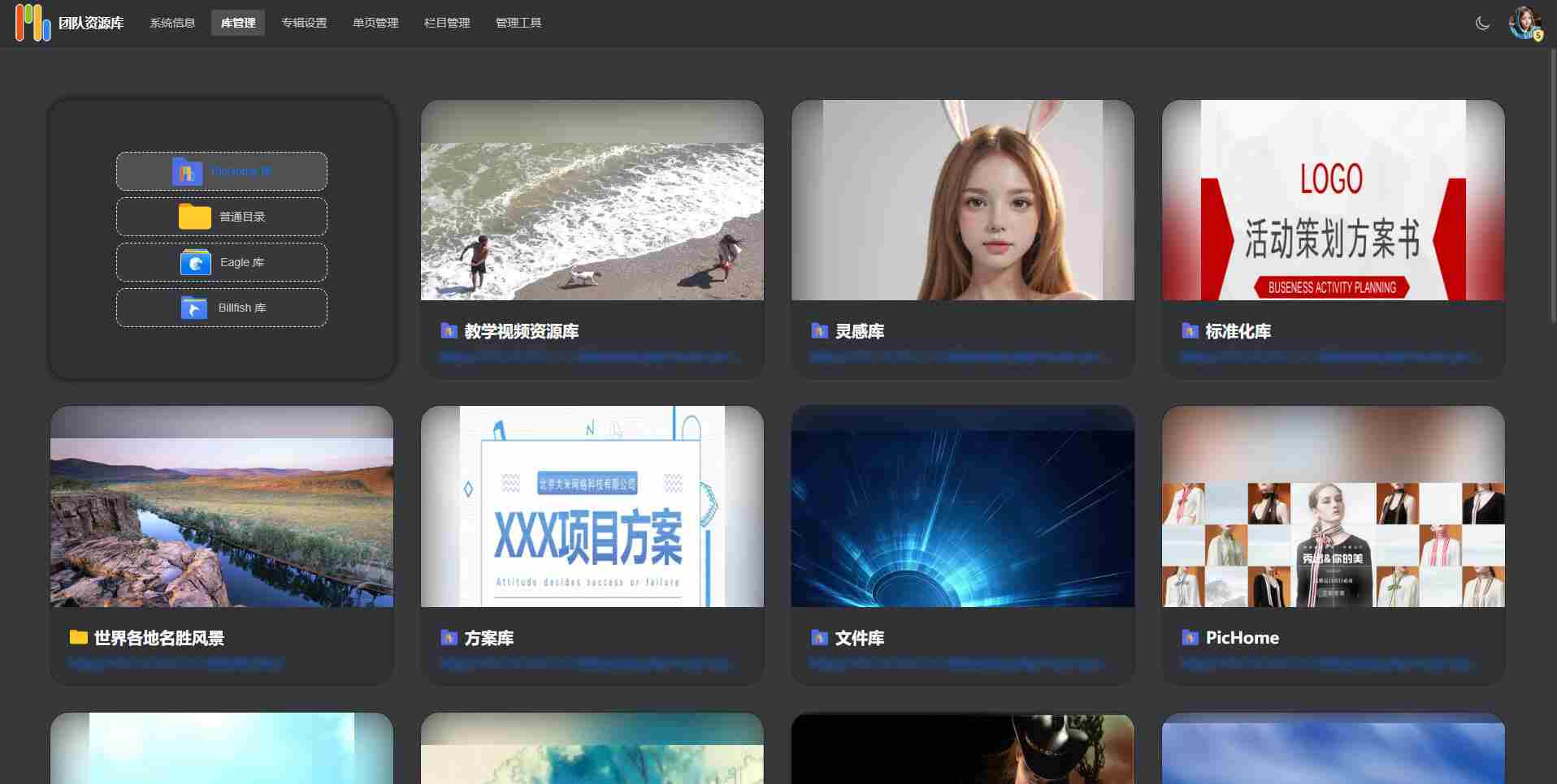 PicHome:支持创建多个网盘库,根据文件类型和业务需求进行分类存储和分配管理权限,提高了文件管理的灵活性和效率。