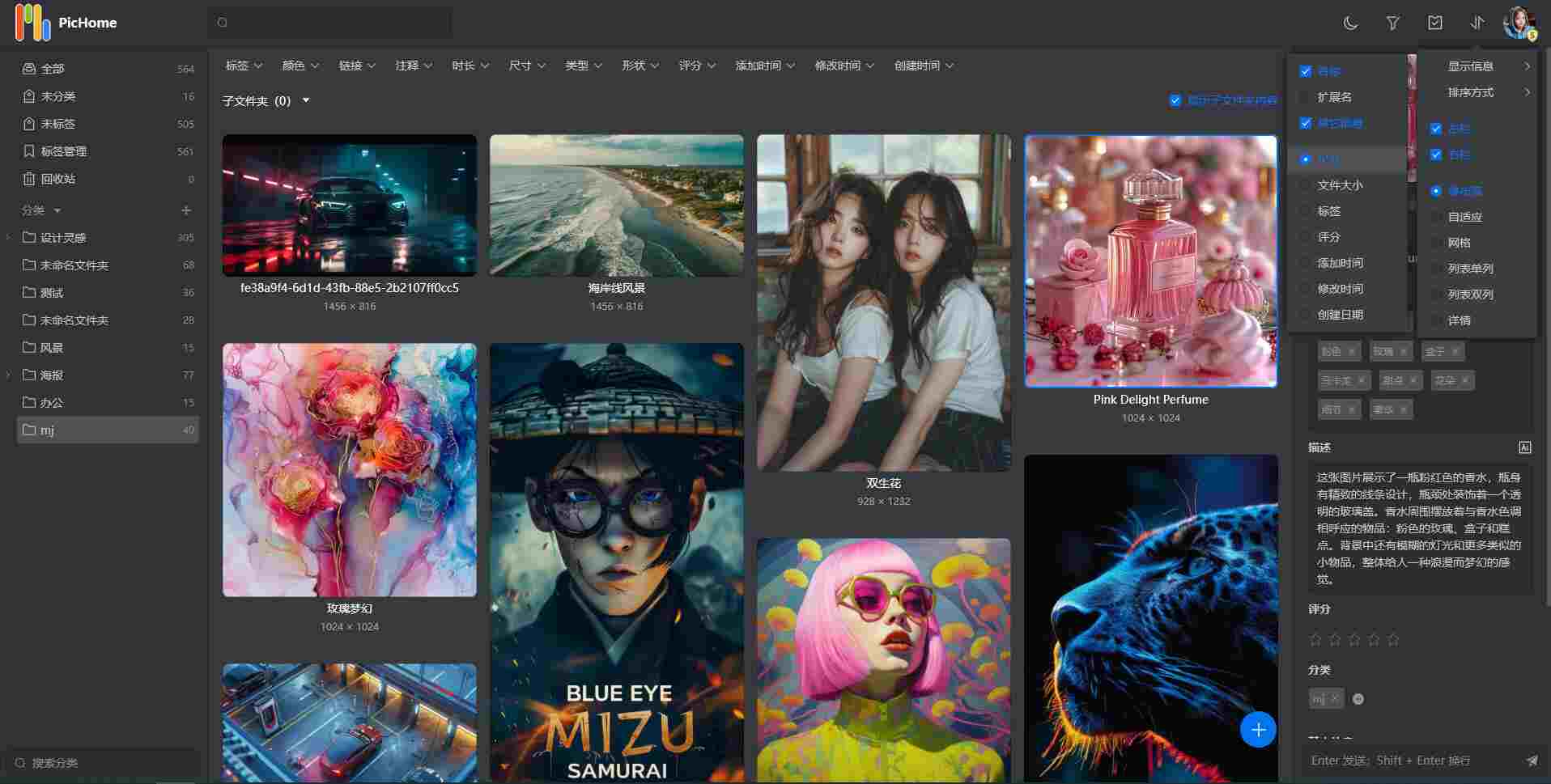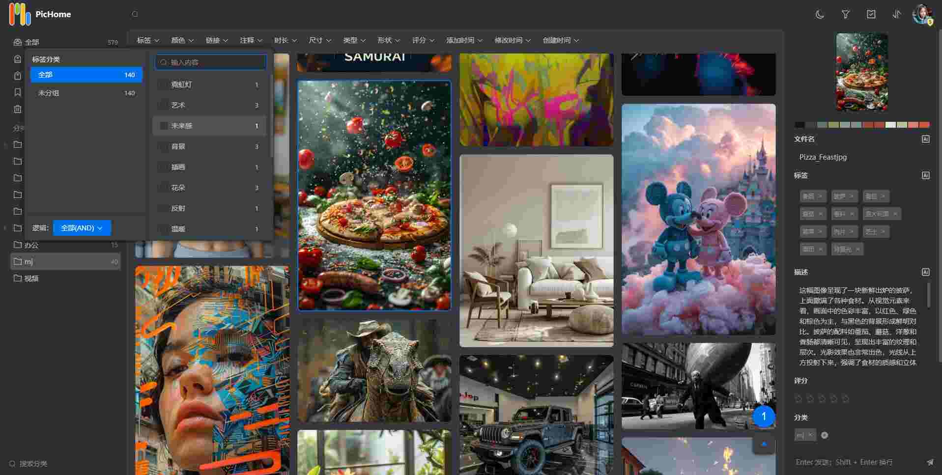 PicHome:支持自动获取图片的颜色、形状等属性,以及音视频的时长等信息,并允许用户添加二级标签、文件描述和评分,从而实现多维度、深度的文件管理。