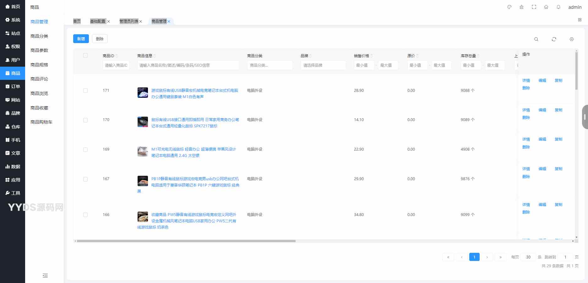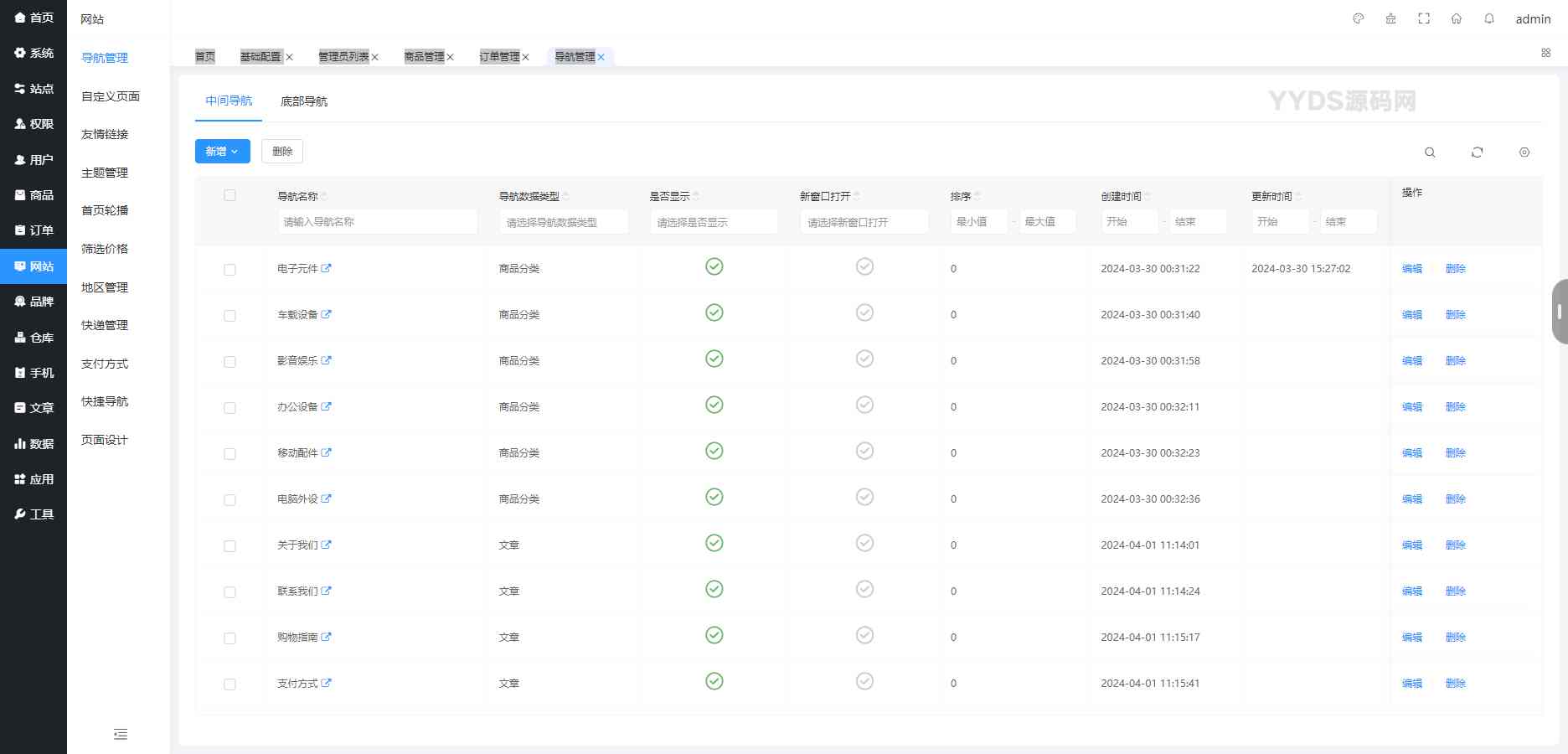 7.网站管理:导航的添加设置,友情链接设置,首页轮播图设置,商品价格筛选设置,地区管理设置,快递设置,支付方式设置,快捷小导航设置,页面自定义设置。