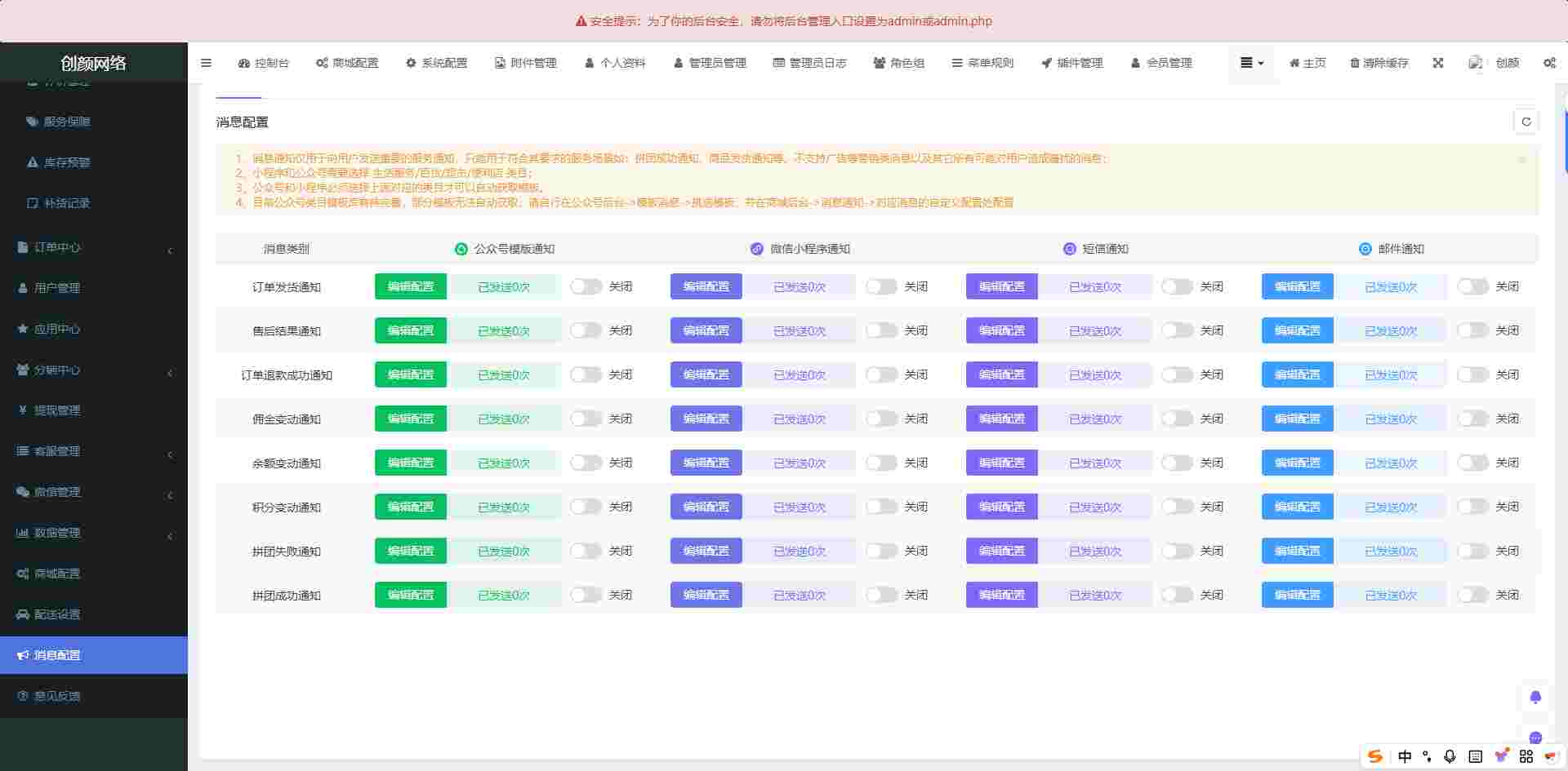 支持微信公众号配置,自定义菜单自动回复、公众号通知配置等;