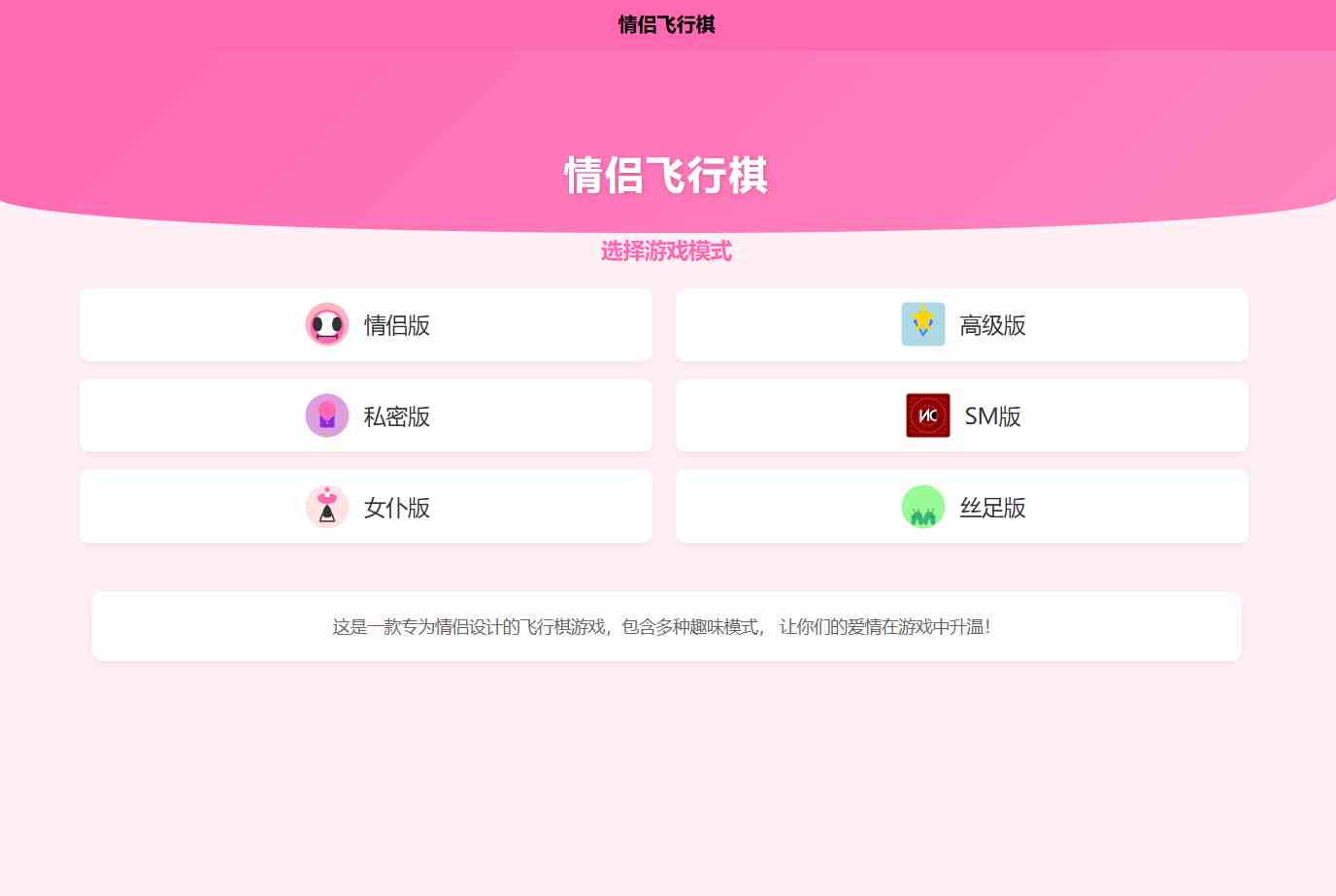 专为情侣设计的飞行棋游戏,多种趣味模式可选,情侣版、高级版、私密版、SM版、女仆版、丝足版都有。男生先行,走到对应格子为对方做惩罚,福利自己享受。