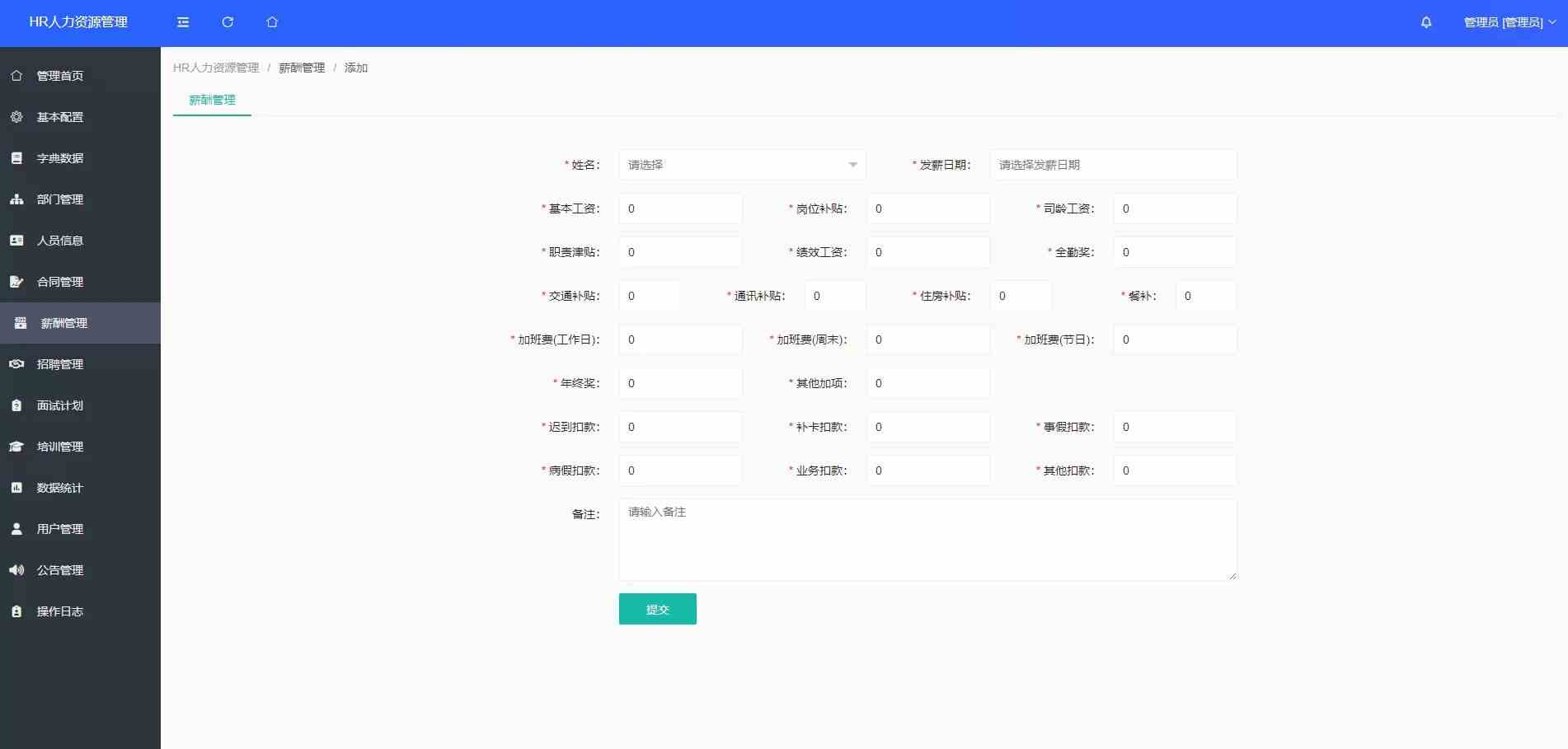 非常全面的一款HR人力资源系统,后台可以管理合同、薪资、员工、部门、招聘、面试、培训、数据统计等等