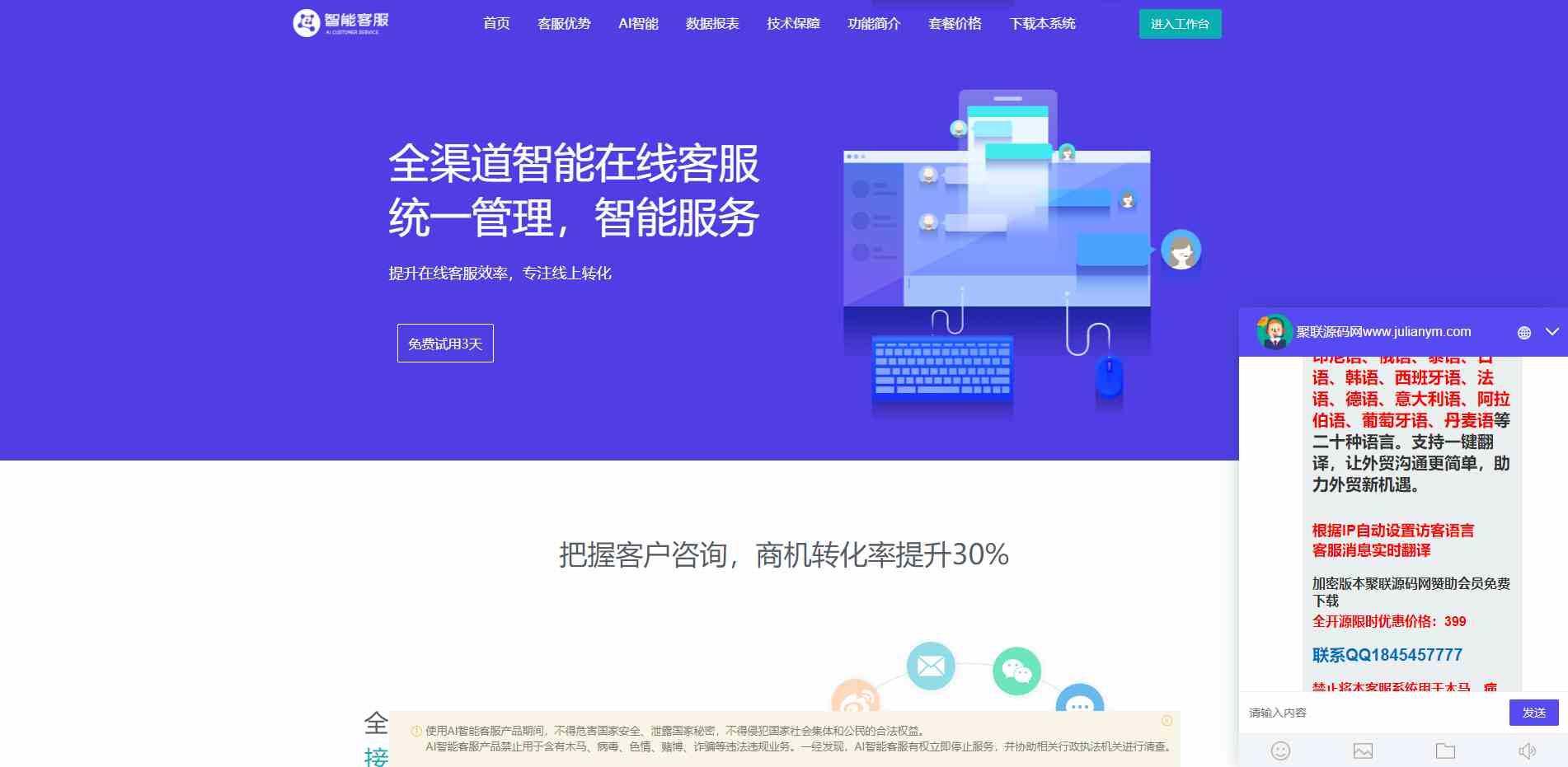 多商户客服、不限坐席、独立系统-数据存储自己服务器上,支持开启SSL、支持离线对话。