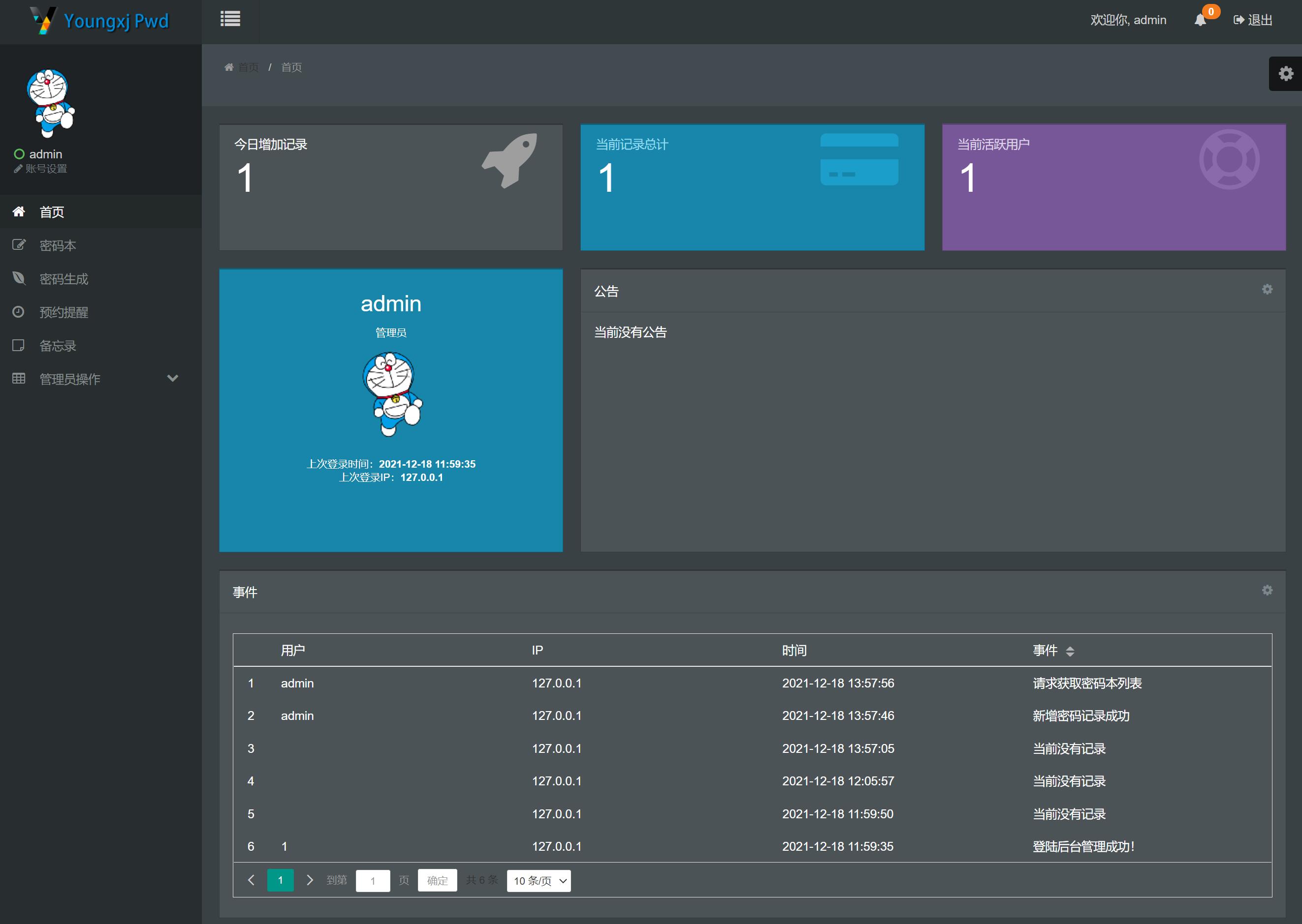 用户管理中心自带的id为1的账号 此账号请勿删除,可以禁用,此账号是作为站长管理员的附属账号,添加的 密码本,备忘录等信息均会附属给id为1的账号,当然如果该账号没有禁用也 是可以单独使用。