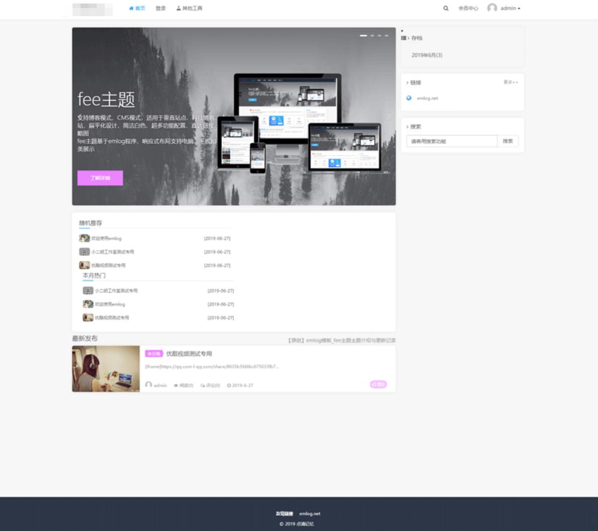 php Emlog四端响应式博客自媒体网站Fee模板V1.7版,fee主题,前端UI来自于vieuV4.0,通过二次开发移植过来的,大气有档次,支持博客模式,CMS模式,适用于垂直站点、科技博客、个人站,扁平化设计、简洁白色、超多功能配置、直达链接、自动缩略图,Fee主题基于emlog程序,响应式布局支持电脑、平板和手机的完美展示。