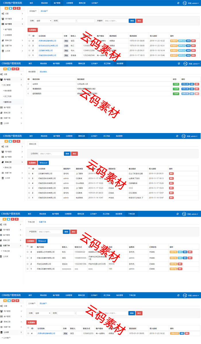 以上为云码素材crm客户管理系统大概的模块功能,具体的很多细节功能,没有详细的说明。详细的功能,就查看演示站,也可联系云码技术工程师QQ:79246760,在云码素材购买的此款crm客户管理系统,支持永久更新,和定制功能开发。