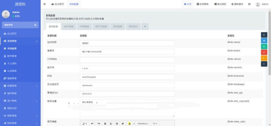 源授权是一款全新架构的授权系统.采用thinkphp 5.0开发,内置各种强大的功能,邮件管理,腾讯云短信、阿里云短信等.后台强大简洁,使用方便快捷,支付模块集成易支付功能,前台支持自助购买和操作管理授权!