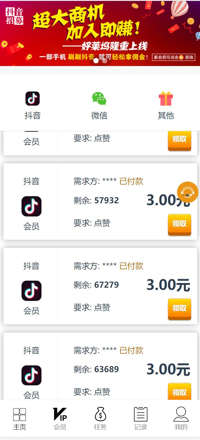 抖音点赞、关注赚钱平台,帮助短视频网红们提高人气,后台发布关注点赞任务,然后会员接单,完成有佣金,不同级别的会员每天接的数量不一样,带三级分佣推广系统