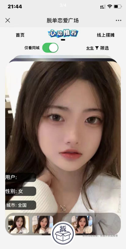 H5盲盒交友源码抖音最火项目,特色功能;自定义虚拟数量、推广海报、IP黑名单、自定义价格、强制先留在抽、区分普通盲盒和条件盲盒、新闻和广告模块,等众多功能