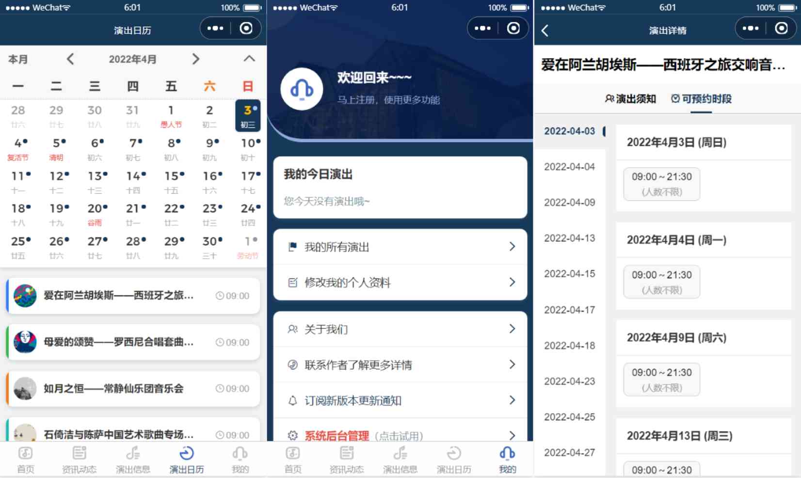 音乐厅小程序,包括资讯动态,演出信息,艺术教育,经典 剧目,商务合作,关于我们,公益演出预约,商业演出预约,演出日历,我的今日预约,我的预约码,后台预约管理,后台预约核销,后台CMS内容管理等功能模块。是一个数字化的艺术殿堂公共平台,无需下载安装,让您能够随时随地便捷地走近乐团、走近交响乐